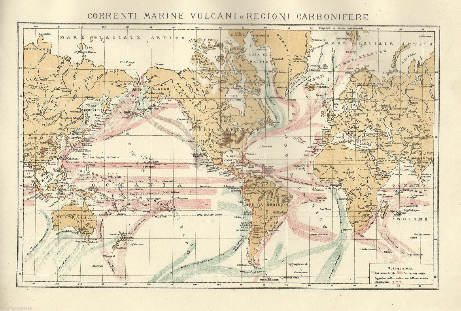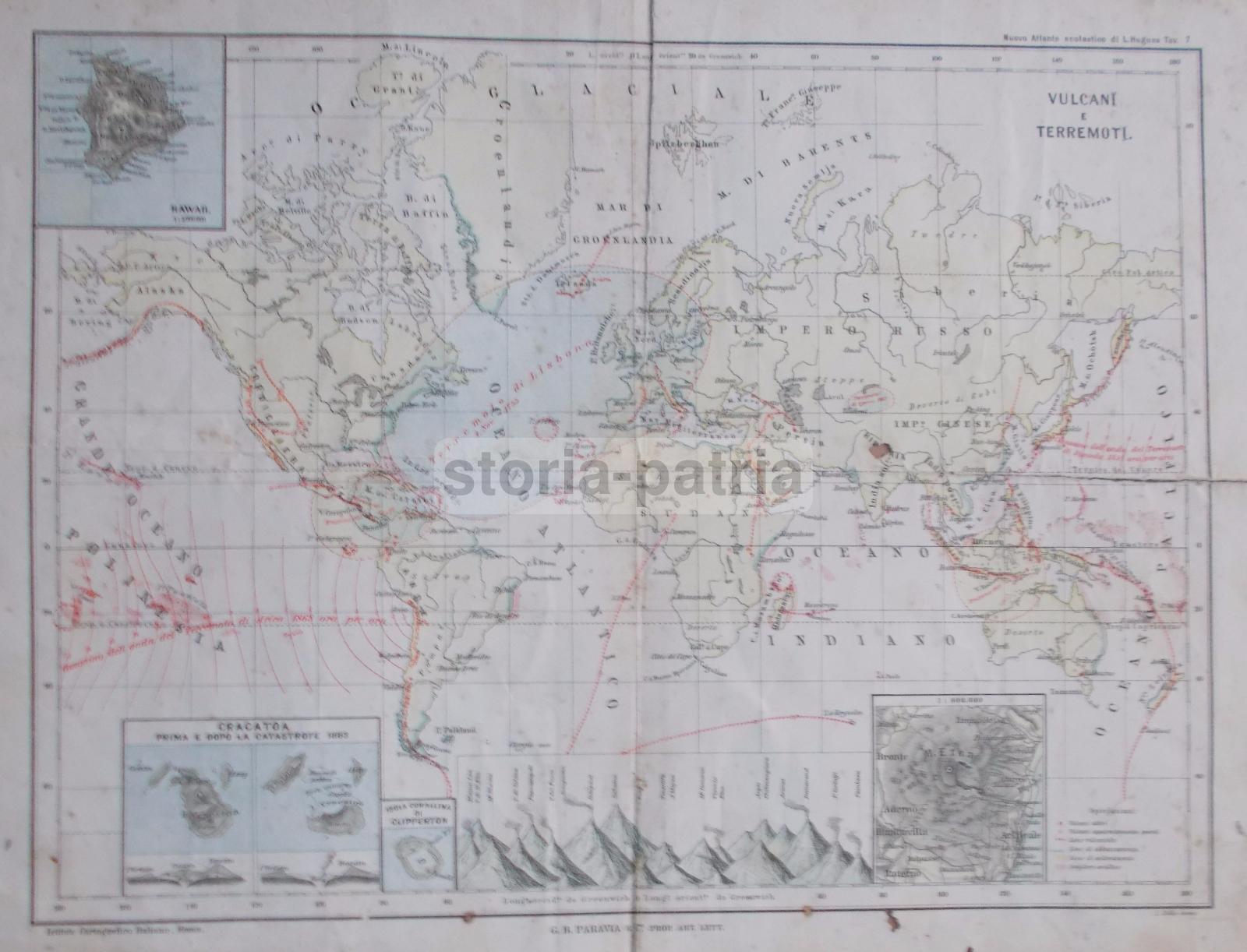 GEOGRAFIA DEI VULCANI ACCESI ED ESTINTI Interessante edizione antica e d'epoca,inusuale mappa geografica, con evidenziata la posizione dei ...